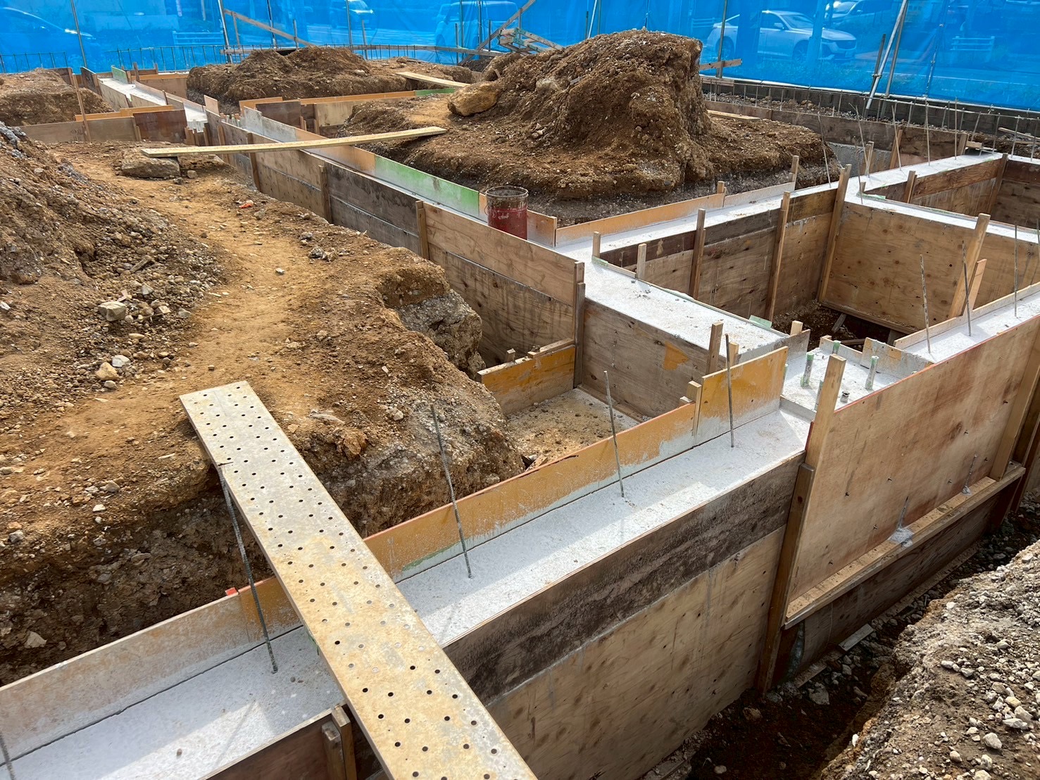 建物が大きくなればなるほど、土の出る量はすごくなりますよね!なので、大型の車両で排出していきます! 残土を山にしていき、重機で大型に積み込んでいきます!根切りが終わり次第、ステコン、ベースの段取りに入ります!ベース枠を起こし、鉄筋を組み、最初の打設になります。