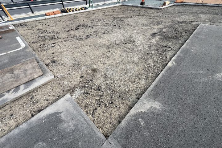 最初に洗車場と洗車後の車両駐車場、手洗い洗車場の位置を決め、全面が舗装だった為、舗装撤去から始まります! 舗装のめくる分は22tぐらいあり、