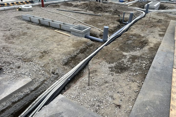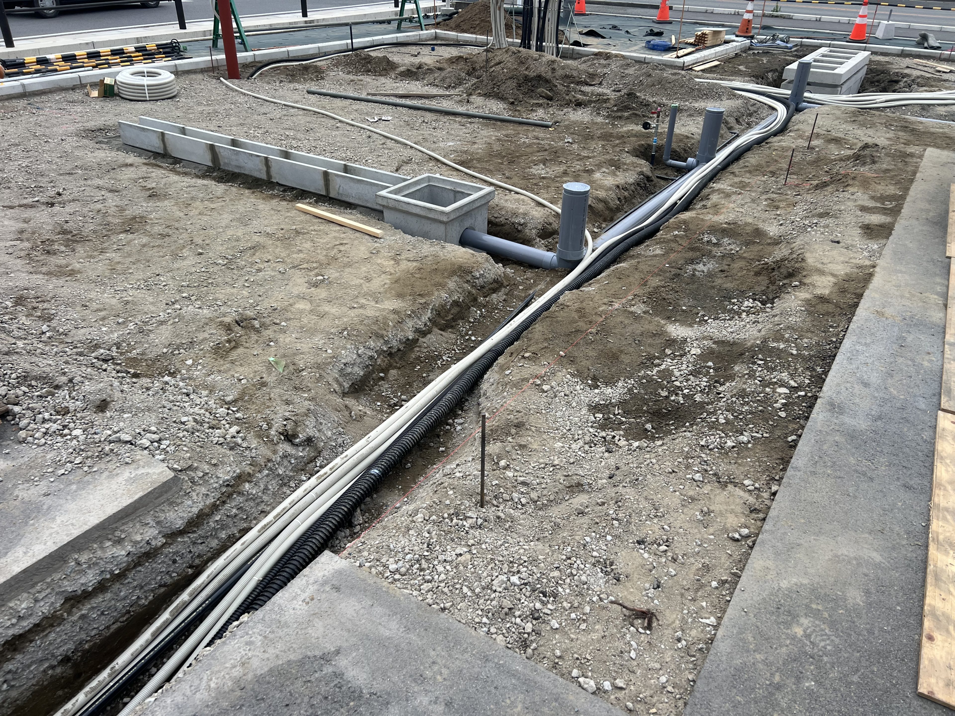 次に鋤き取り、根切りです、分離層や側溝など、設備配管と土間の厚み分鋤き取りとその他の製品の寸法に必要な分だけ根切り、鋤き取りをおこなっていきます!